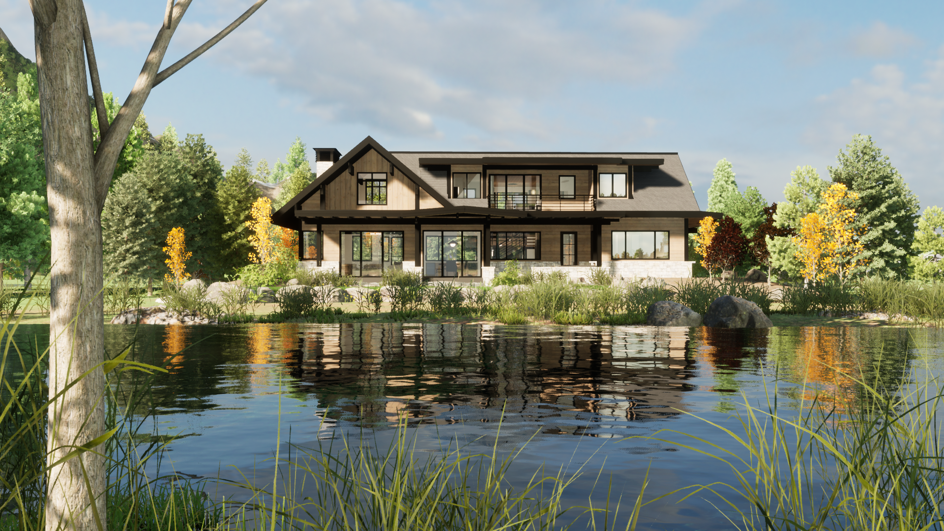 3D modeling and design were utilized to visualize a new build in Lahontan Community, Lake Tahoe CA. 3D Renders were built to scale from architectural plan sets. 3D landscaping and environment were used to tell the full story and highlight the home in its natural surroundings.